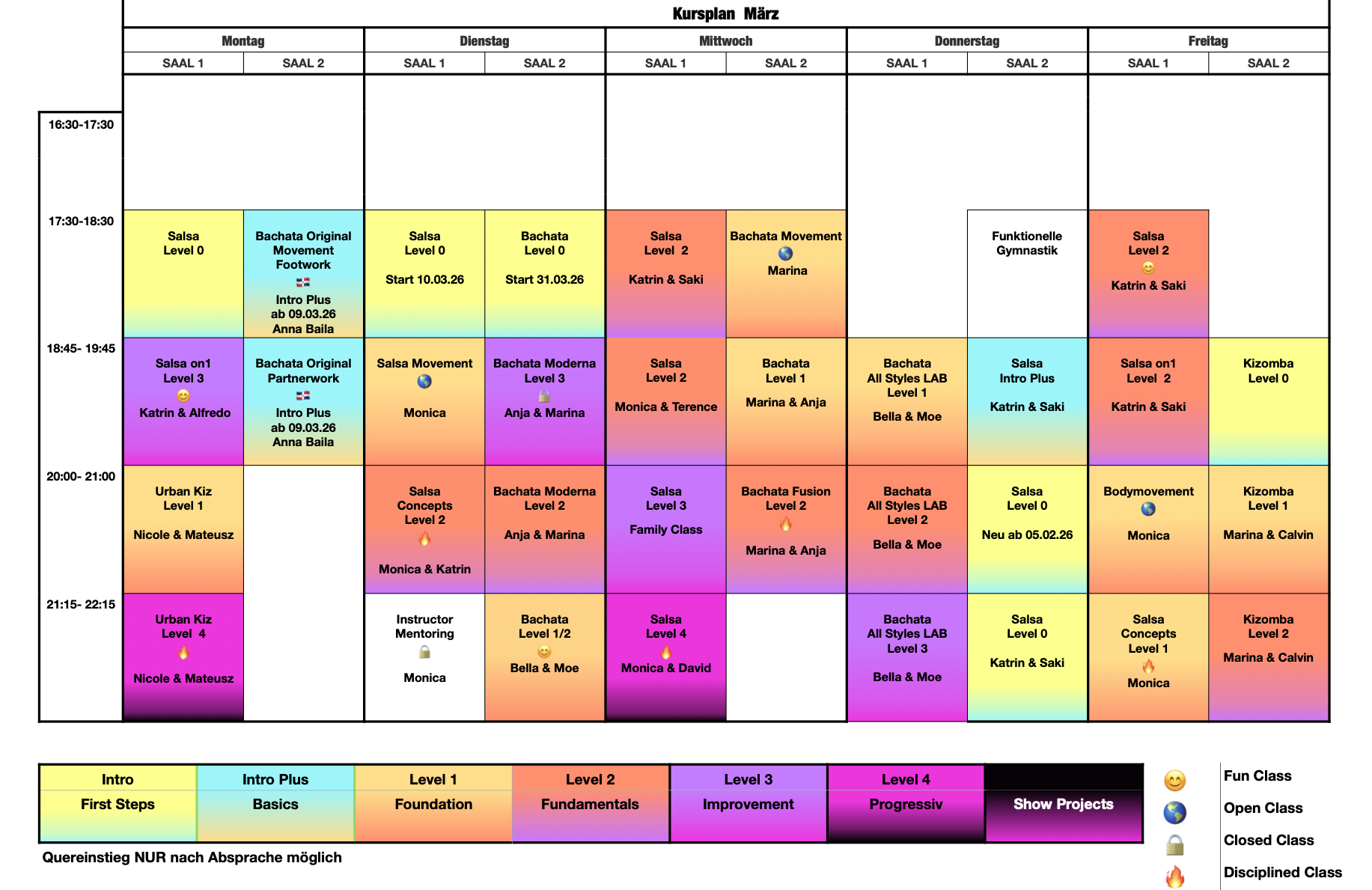 Die level abhängige Zuordnung in die jeweiligen Tanzkurse erfolgt nur über die Tanztrainer.