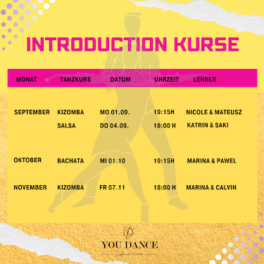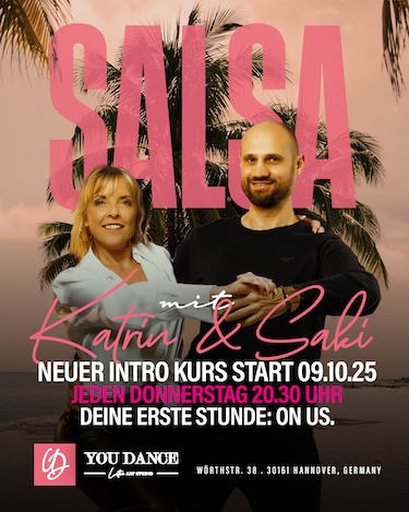 Let‘s Salsa Neuer Einführungs – Kurs,für alle ohne oder mit wenig Vorkenntnissen! Salsa New York Style (On2)Ab Donnerstag, 09.10.2520:30 Uhr Deine erste Stunde ist unverbindlich & kostenlos, kein Tanzpartner erforderlich