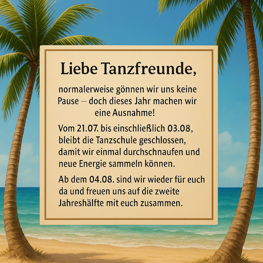 Unsere Tanzschule macht Weihnachtsurlaub vom 22. Dezember 2025 bis einschließlich 4. Januar 2026.